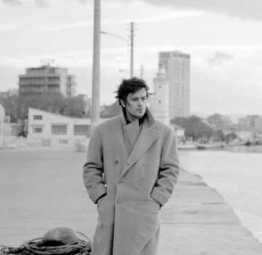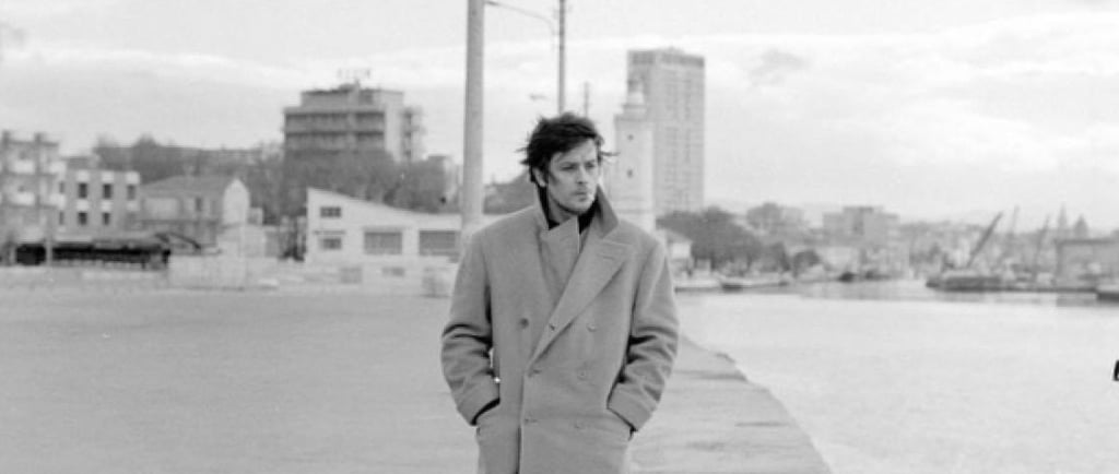 Una sorta di bandiera garrisce al vento: un lungo doppiopetto dentro il quale brillano un paio di occhi azzurri impossibili. Alain Delon attraversa la bruma di Rimini d’inverno, cammina sul molo come un’apparizione. In La prima notte di quiete è Daniele Dominici, professore supplente di Lettere.