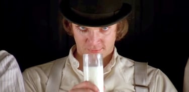L’inquadratura iniziale di Kubrick, in cui Alex ti fissa direttamente, è impegnativa, ipnotica, complice e autoritaria. Introdotto in questo mondo violento sei bloccato con uno psicopatico come unico e principale eroe. Intrappolato e affascinato, attratto e respinto, guardi, ascolti e godi e questo perché per un ragazzo del genere non puoi che provare una sorta di attrazione, fattene una ragione. La sua sociopatica joie de vivre e il suo stile non a caso diventano presto mito, grazie ai costumi (bombetta, tuta bianca, anfibi, bastone, maschere, nasi fallici e pinocchieschi), alle scenografie (il Korova Milk Bar e le sue bianche statue di donne nude), al montaggio pop-art e musicale, all’uso stravolto ‒ geniale contrappunto ‒ di brani di musica classica (Purcell, Rossini, Beethoven) e di musica leggera (Singin’ in the Rain), alle riprese che vedono susseguirsi lentissimi carrelli, rapidissimi zoom, ralenti, accelerazioni, obiettivi deformanti, cinepresa tenuta a mano, tutto sotto l’algido bagliore di una fonte di luce quasi sempre in campo.