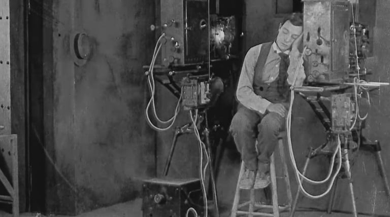 Forse più di Chaplin, però, un altro comico muto americano ha riconosciuto i legami tra sogno e cinema. In Sherlock, Jr. (1924), Buster Keaton interpreta un proiezionista che si addormenta sul lavoro e sogna di entrare nel film come detective. Gli altri personaggi sono incarnati dai suoi conoscenti del mondo reale, ma il concettuale punto cruciale di Sherlock, Jr. arriva mentre Buster si abitua al suo nuovo ambiente cinematografico, apparentemente entrando nello schermo del film e realizzando che può fare il giro del mondo in un batter d’occhio (o, più precisamente, in 1/24 di un secondo). Una serie di rapide immagini lo mostra mentre passa da un vivace incrocio a un ripido precipizio di montagna, da una giungla africana a un deserto arido, il tutto realizzato attraverso rapidi tagli. Sogno e cinema sono letteralmente intrecciati qui; in effetti, dove altro la realtà fisica può sembrare cambiare forma in una frazione di secondo? Come nei sogni, lo spazio e il tempo qui si piegano e si intrecciano, prendono vita e sfilacciano i propri confini. Tutto torna, come dice Fellini: “Parlare di sogni è come parlare di film, poiché il cinema usa il linguaggio dei sogni; gli anni possono passare in un secondo e puoi saltare da un posto all’altro. È un linguaggio fatto di immagini. Ogni oggetto e ogni luce significano qualcosa, come in un sogno”.