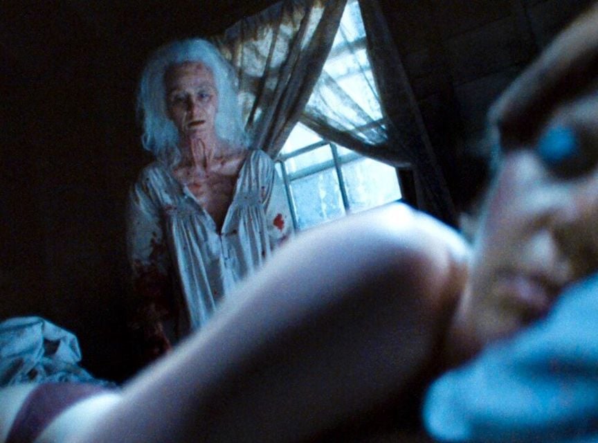 Segue una lenta inquadratura su due cadaveri in avanzato stato di putrefazione accompagnata da una voce radiofonica che descrive alcuni macabri avvenimenti legati ai cimiteri. La scena successiva ai titoli di testa viene ripresa da Ti West, che tuttavia sostituisce l’armadillo morto sul ciglio della strada con una mucca, sulle cui interiora sparse per terra passerà il furgone dei protagonisti. Il furgoncino stesso è un riferimento a Hooper e alla controcultura anni Settanta, e, in entrambi i casi, ci accompagnerà attraverso situazioni ambigue, che ci fanno fin da subito presagire il peggio. Nel caso di Hooper incontriamo un anziano ubriaco che farfuglia qualcosa a proposito di «cose che non vanno raccontate» e, poco dopo, un autostoppista che comincia a parlare di tecniche di macello. Nel caso di West, una volta che i protagonisti arrivano a destinazione in una vecchia fattoria presa in affitto per girare un film porno amatoriale, verranno accolti minacciosamente da un vecchio con un fucile che chiede loro di lasciare stare la moglie, che però vedremo spesso affacciata alla finestra intenta a spiare le riprese.