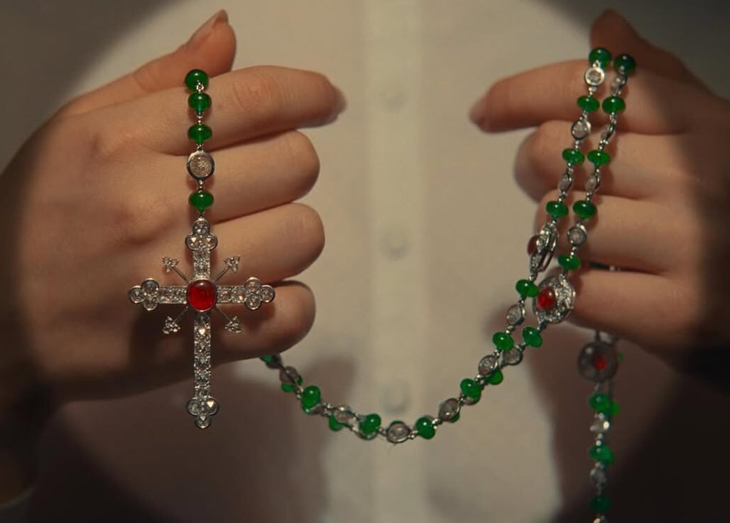 This negotiation vividly manifests through potent visual symbols: materially, as the daughter's red plastic rosary gives way to a shimmering green Cartier’ s one; spiritually, through the father's imagined trials within a bureaucratic court. Far beyond simple object swaps or static visual frames, these elements collectively forge the assignment of a new place in society and a relentless negotiation of identity, where symbols of faith and morality merge with opulence and expectations.