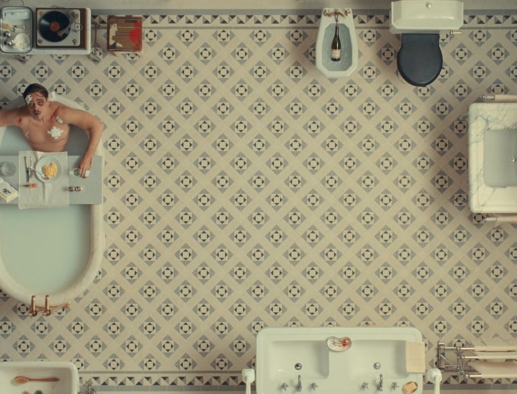 The true darkness, the kind that only fully reveals itself upon reflection, seems rooted in an unsettling new way Anderson portrays his aesthetic within his narrative universe. Usually seen as a pure expression of artistic rationality, here it reveals a world where every meticulously orchestrated detail expresses the rigid, rational structure of social reality. Within the first 20 minutes, we are already presented with a moment that encapsulates the essence of this black comedy and its darker tones.
