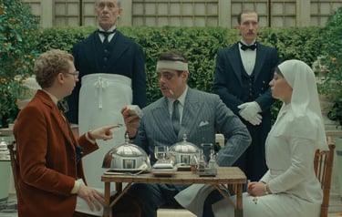 This is a classic Wes Anderson setup, an attempt at "clarity and rapid communication," where efficiency is the most valuable outcome. However, in The Phoenician Scheme, this philosophy isn't limited to form; you’ll see that it permeates the very substance of the narrative and its characters and is slowly passed to his protagonists, particularly the main character, whose entire existence is structured in a highly bureaucratized manner, where emotion is banished from the decision-making process. Even his aesthetic this time isn't just an embellishment, but seems to be a mechanism of control and the imposition of an already defined reality. Every scene, every dialogue, feels like a report, a visual annotation in a larger dossier.